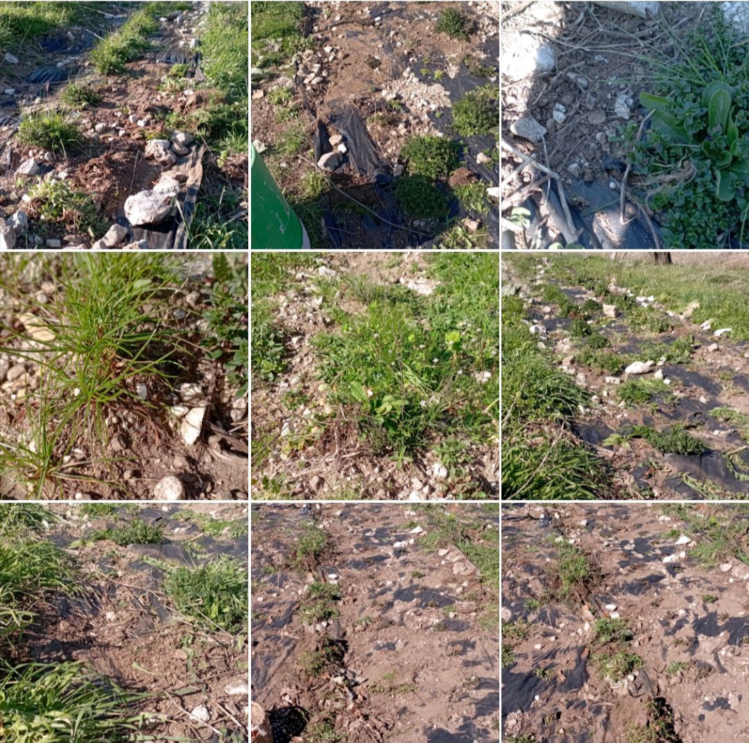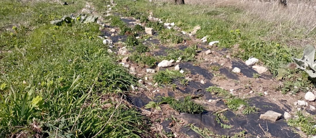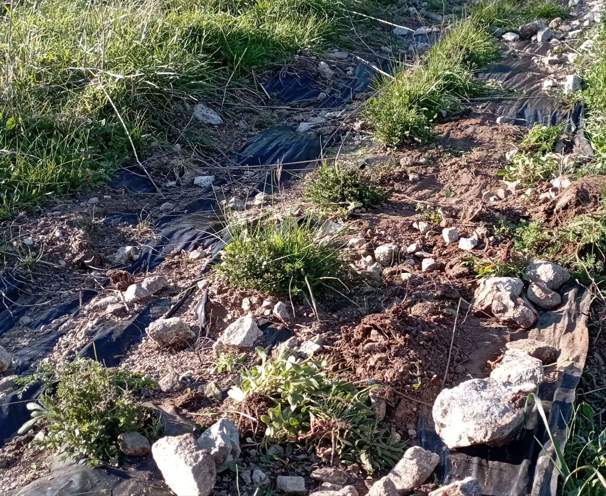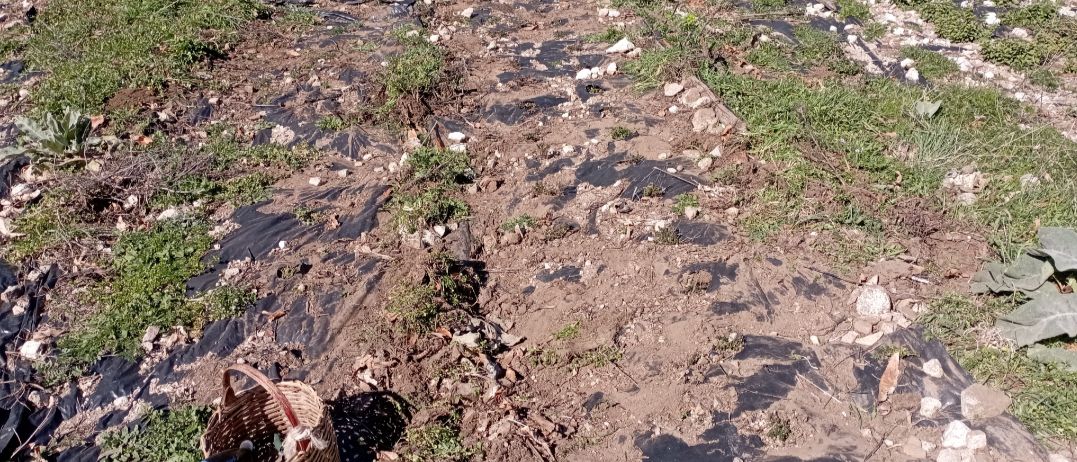 Dove ho tolto il telo nero di pacciamatura la pianta è invisibile, sormontata dalle piante spontanee.